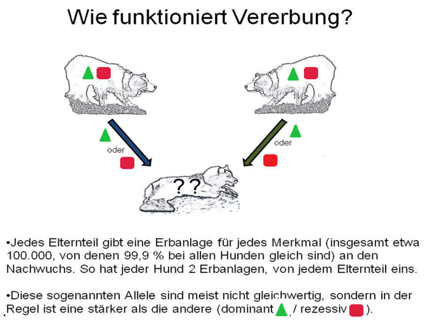 Die Erbanlagen, die in Form von Genen verschlüsselt auf der DNA liegen, bewirken die Ausbildung aller körpereigenen Merkmale, sie sind quasi der Bauplan des Körpers. Jedes Gen kommt zweimal vor; eines wurde vom Vater und eines von der Mutter vererbt. Man spricht von zwei Allelen. Ein Tier kann zweimal das gleiche Allel tragen und ist dann homozygot oder reinerbig, oder es kann zwei verschiedene Allele eines Gens tragen, dann ist es heterozygot oder mischerbig. Setzt sich die Wirkung eines Allels über die des anderen durch, so verhält sich ersteres dominant, letzteres rezessiv. Ist beispielsweise eines der Allele eine Defektmutante, kann es das gewünschte Protein nicht bilden. Das Tier hat dann nur die Hälfte der normalen Menge (über das gesunde Allel). Die meisten Merkmale werden additiv vererbt, d.h. der Phänotyp ist dann halb so stark wie bei reinerbig normalen Tieren. Reicht die Hälfte an Protein aus, das Merkmal vollends auszubilden, so ist das normale Allel dominant; wird das Merkmal hingegen nicht ausgebildet, ist es rezessiv.