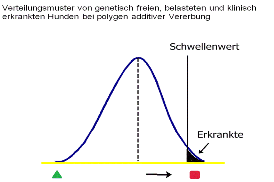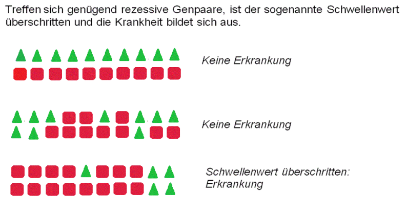 Hier müssen mehrere Gene reinerbig für das schwächere, rezessive Allel sein, bis es zum Überschreiten eines Schwellenwertes kommt und damit zur Ausprägung der Erkrankung.