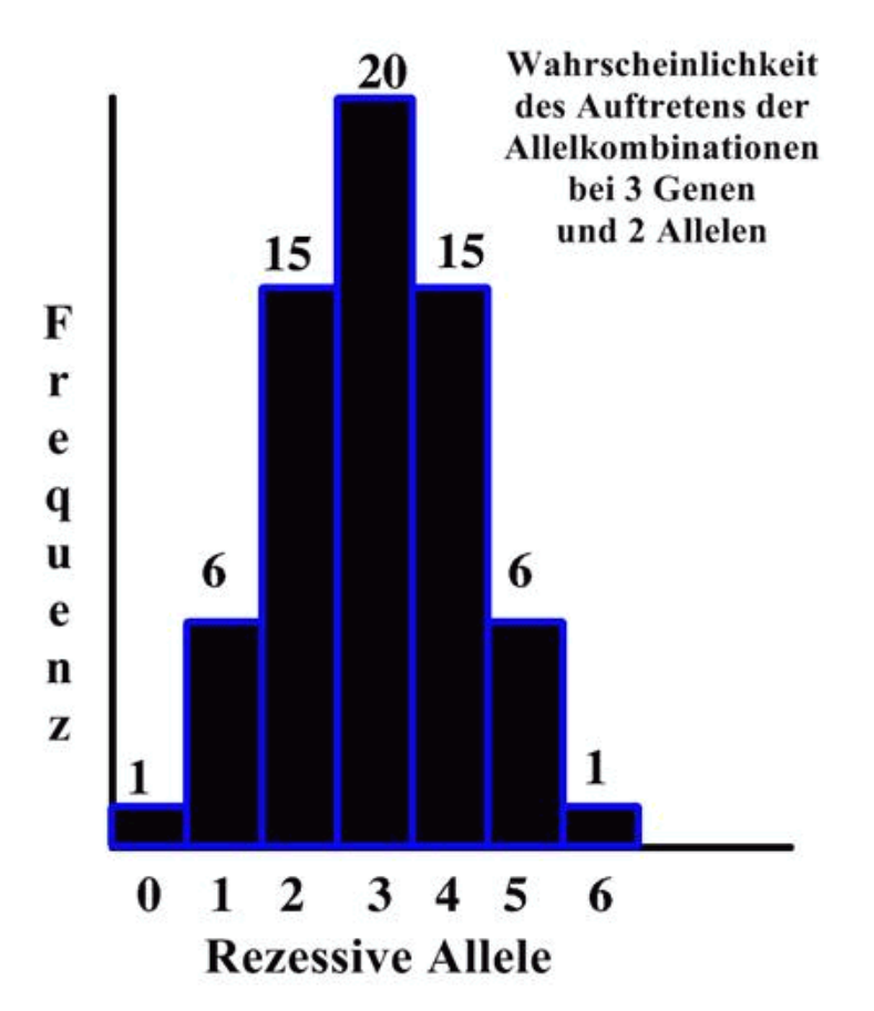Gab es bei einem Erbgang mit einem Gen noch 3 verschiedene Möglichkeiten, so steigt die Möglichkeit der Genverteilung exponential zur Anzahl der Gene, die an der Merkmalsausprägung beteiligt sind.