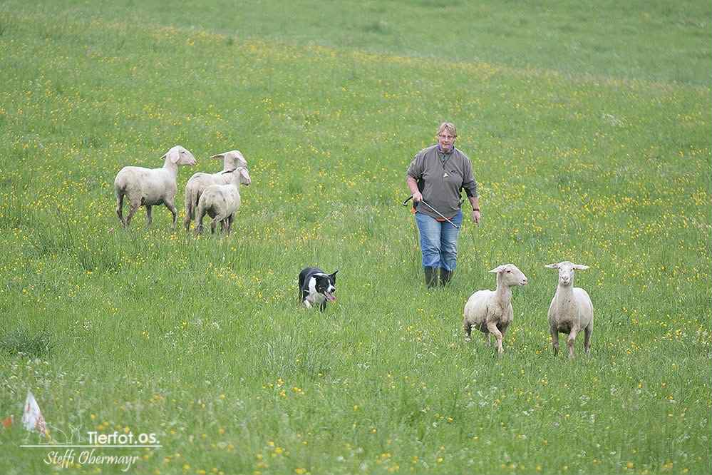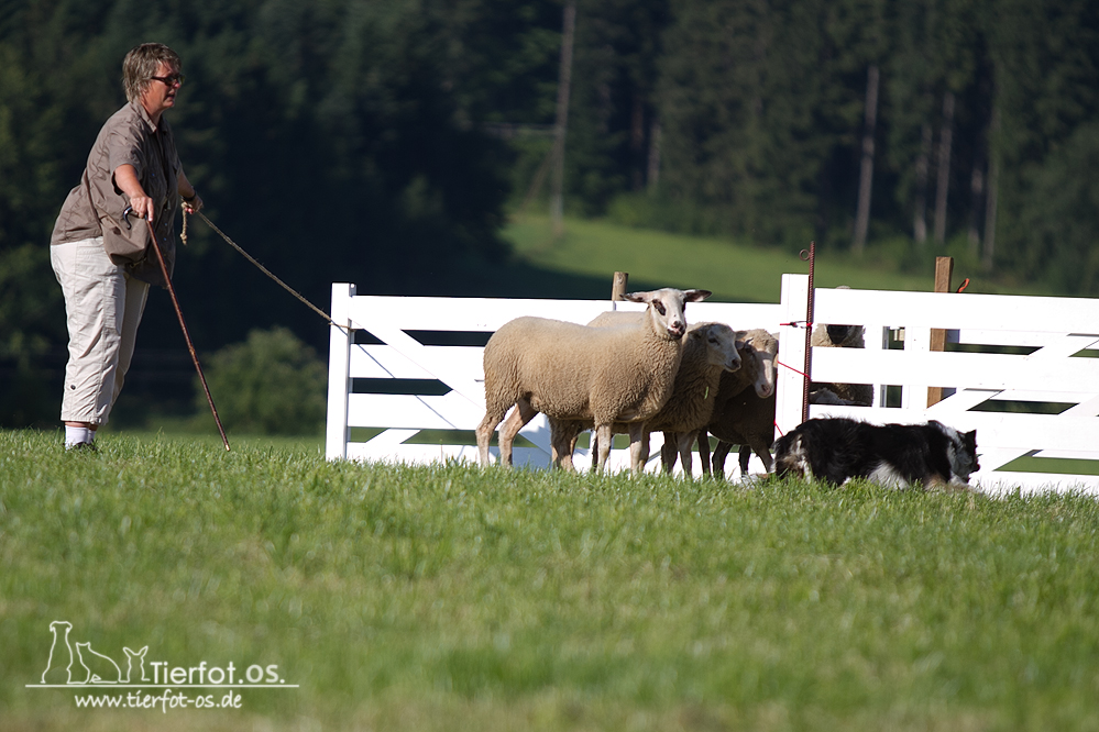 Der Hund hat die abgetrennten Schafe eindeutig zu kontrollieren. Damit beweist er seine Fähigkeit, einzelne Tiere von der Herde wegzunehmen und fortzutreiben, wie es auch bei der täglichen Arbeit vorkommt.